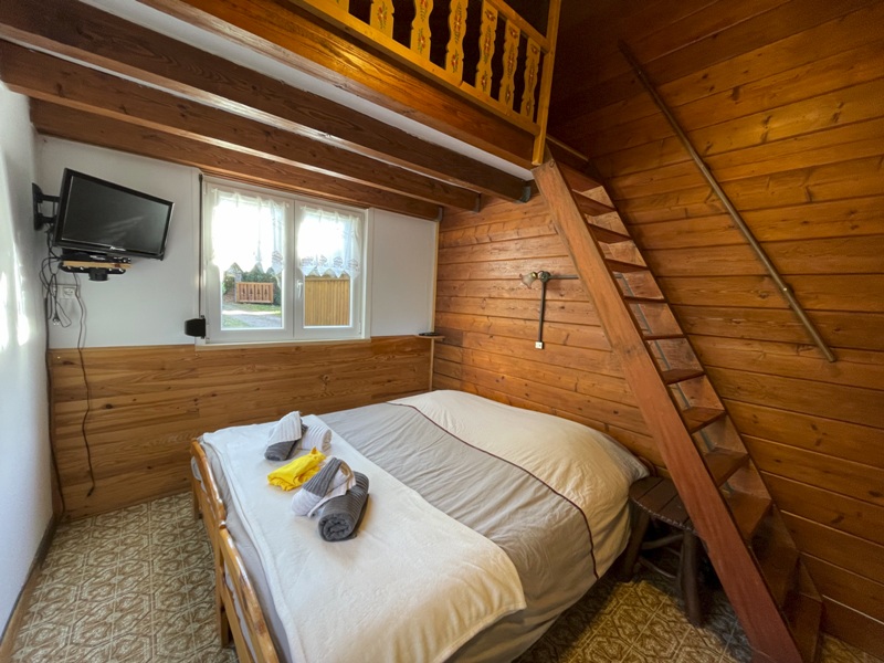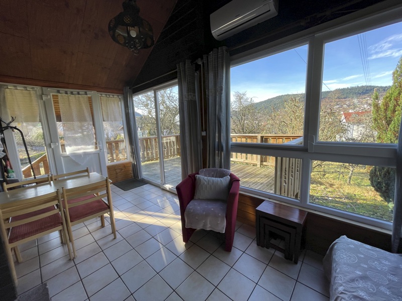 Chalet comprenant véranda avec coin repas et salon, grande terrasse, cuisine équipée neuve, salle d'eau (douche, vasque et WC), 2 chambres dont 1 avec petite mezzanine.