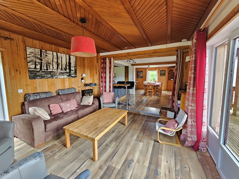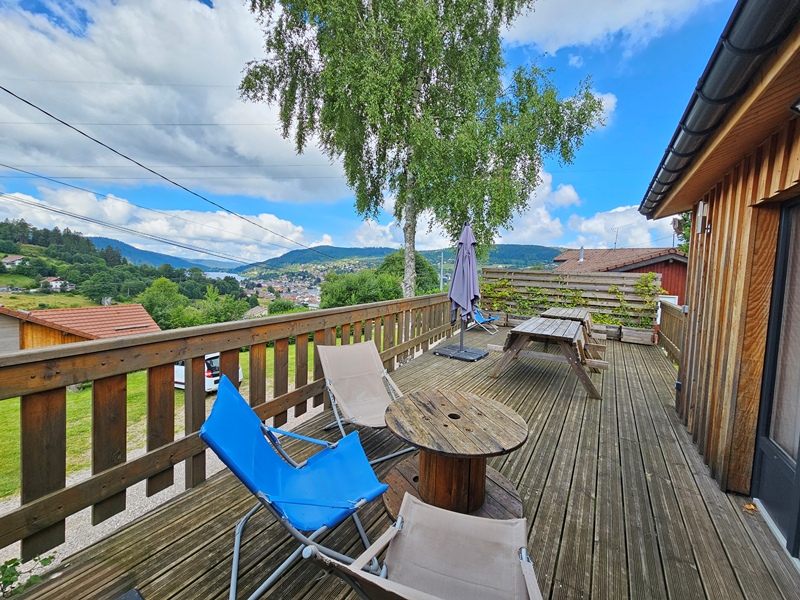 Chalet comprenant au RDC : entrée avec dégagement et rangements, cuisine équipée ouverte sur grand salon / séjour avec poêle à bois et accès grande terrasse bois vue lac, chambre, salle d'eau avec WC.